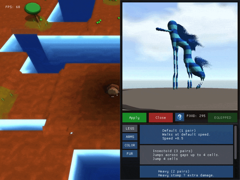 SPLICE is an idler I'm building solo. Instead of watching numbers go up, you assemble the creatures that do the collecting — pick legs, arms, fur, body shape, color — then watch them wander, gather food, and bring it home to the nest. Tweak their behavior tree (a tiny visual editor — if/then blocks) to make them smarter, and they'll out-collect their default selves.